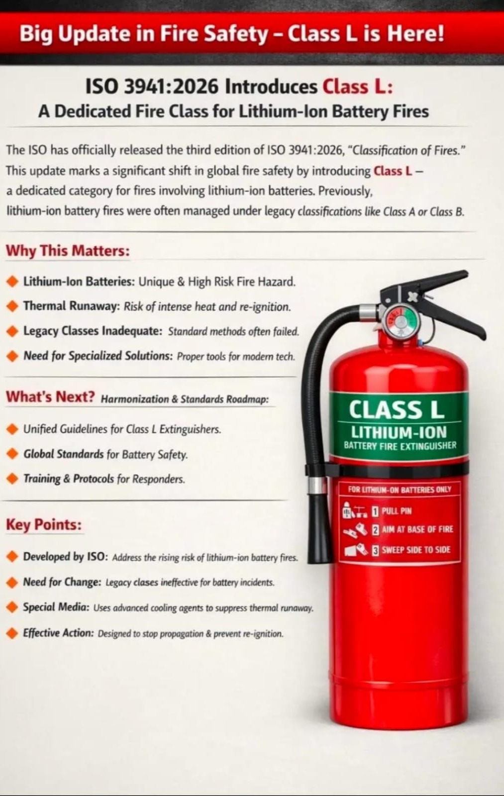 The introduction of Class L under ISO 3941:2026 represents a major step forward in recognizing the unique fire hazards associated with lithium battery technologies.